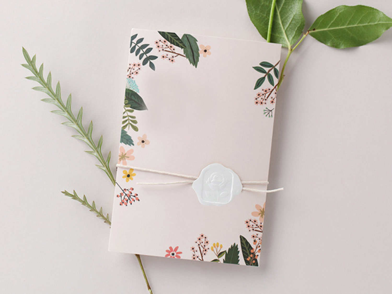 ピンクトーンの背景に爽やかなリーフをカラフルにデザイン。彫刻のようなバラの花のパターンは高級シーリング風、リボンで留めます。