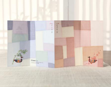 きれいな伝統婚礼服を着た新郎新婦が印刷されています。結婚への誓いを立てる二人をほわっと温かい雰囲気の色合いで演出しています。