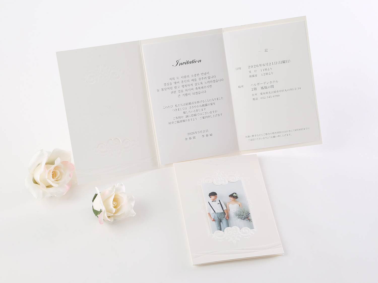 写真カードを招待状の表紙に差し込むタイプ。カードを開くとあいさつ文が。