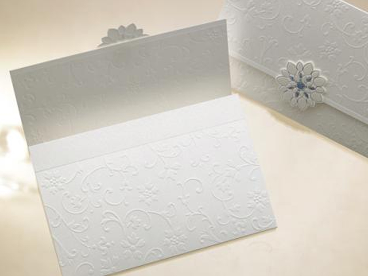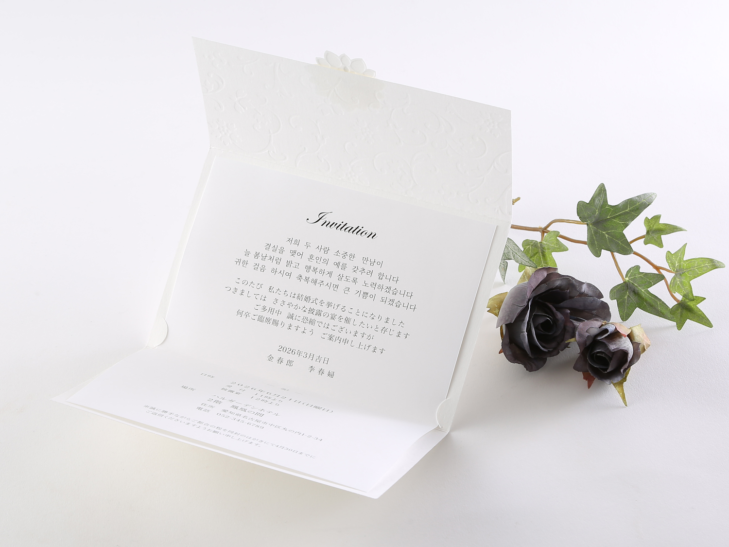 美しいジャガード模様のエンボス加工が見事な招待状。中紙を挟み込むタイプ。