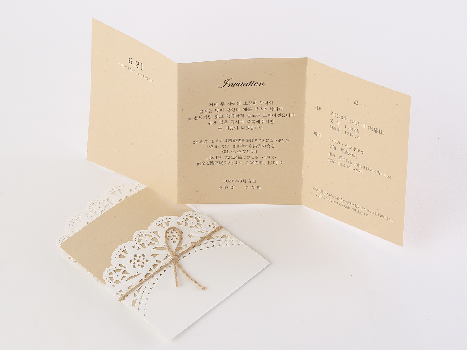 花柄パターンのナチュラルな招待状。麻紐で結んだポケットの中にクラフト素材の中紙を挟み、表にお2人の名前と挙式日を印刷できます。中紙はタテ三つ折りタイプで左右に開きます。彫刻のようなレーザー加工が素朴でおしゃれなディテール。