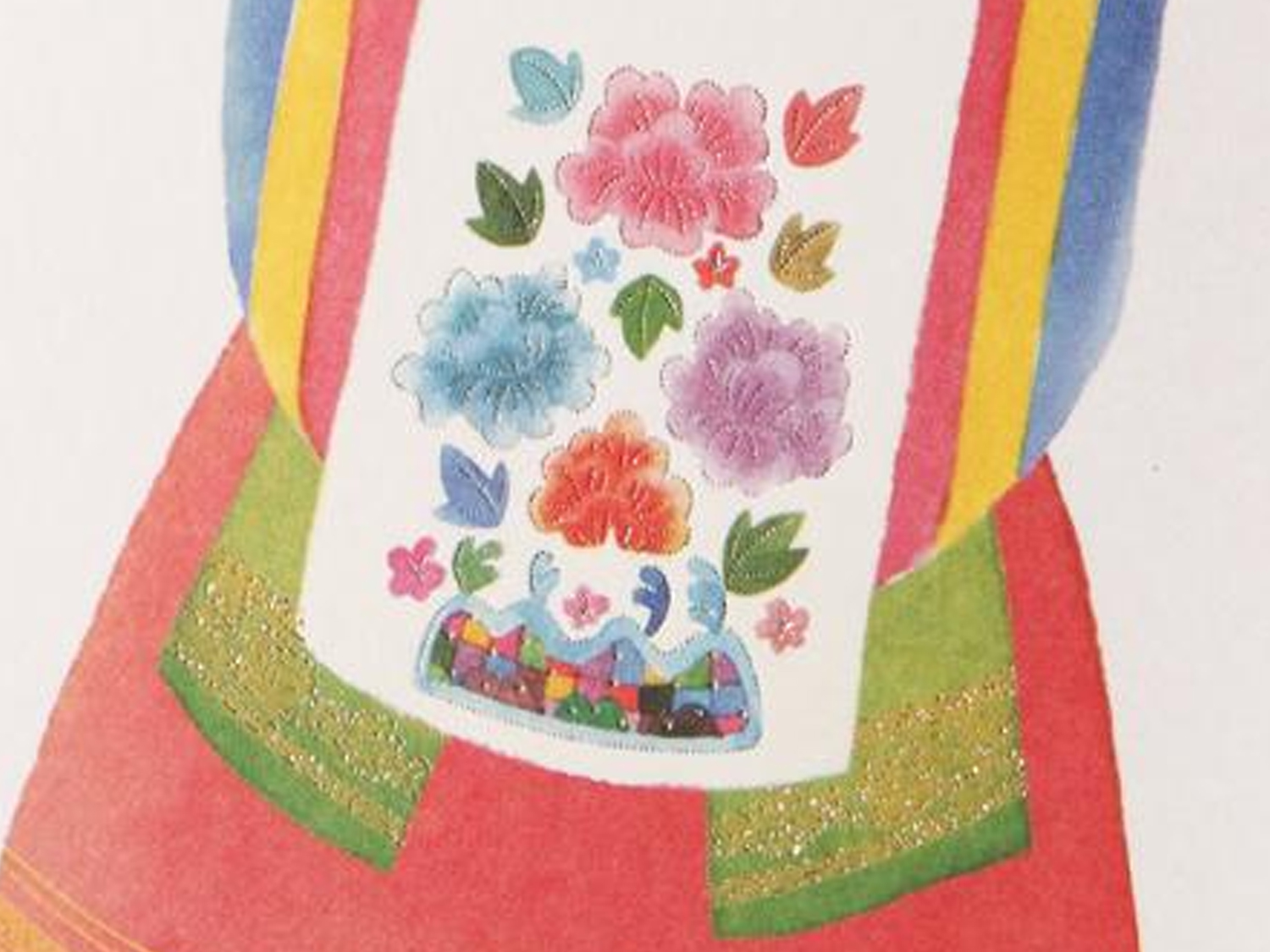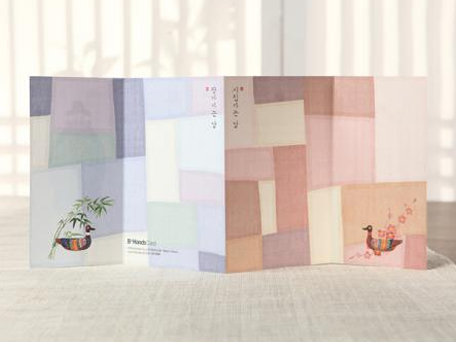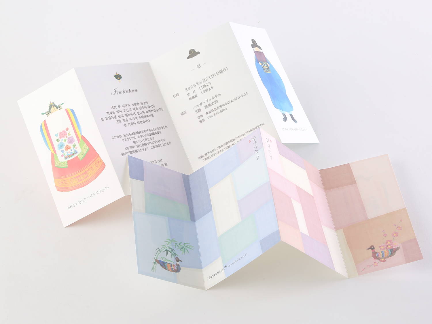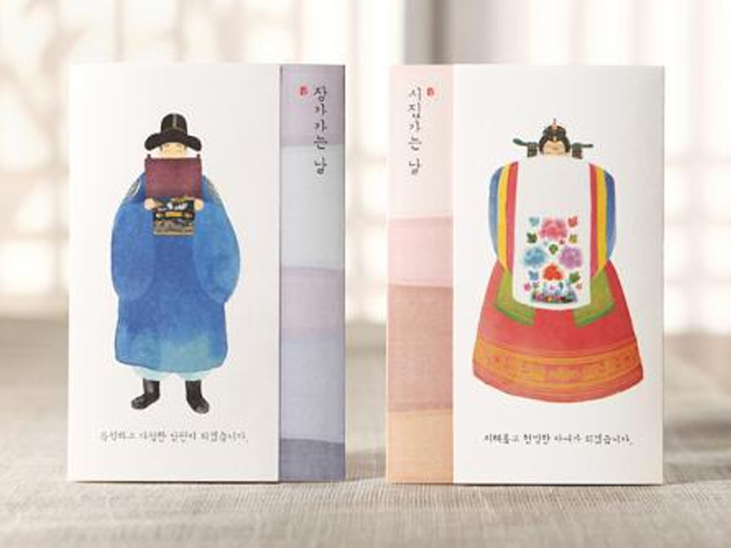きれいな伝統婚礼服を着た新郎新婦が印刷されています。結婚への誓いを立てる二人をほわっと温かい雰囲気の色合いで演出しています。