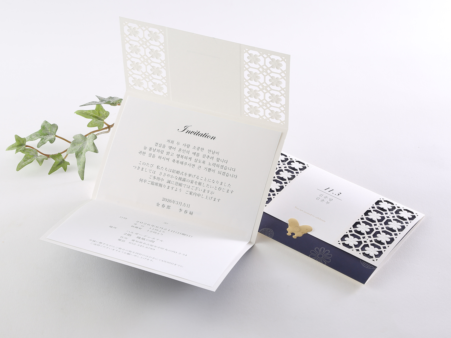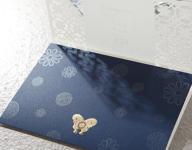 お花をモチーフにした韓国の伝統模様が引き立つカード。輝く金箔の蝶が華やかです。