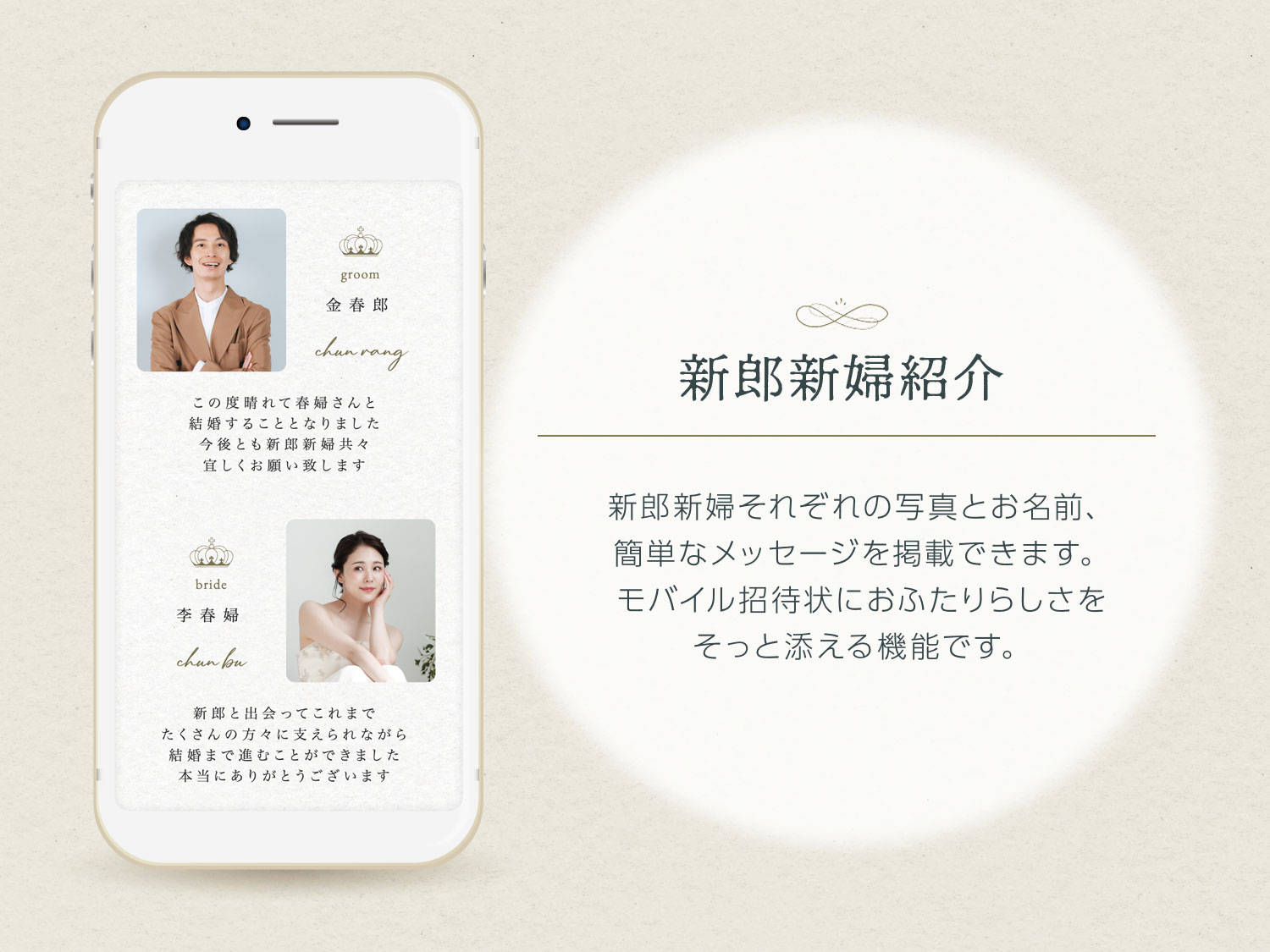新郎新婦それぞれの写真とお名前、簡単なメッセージを掲載できます。 モバイル招待状におふたりらしさをそっと添える機能です。