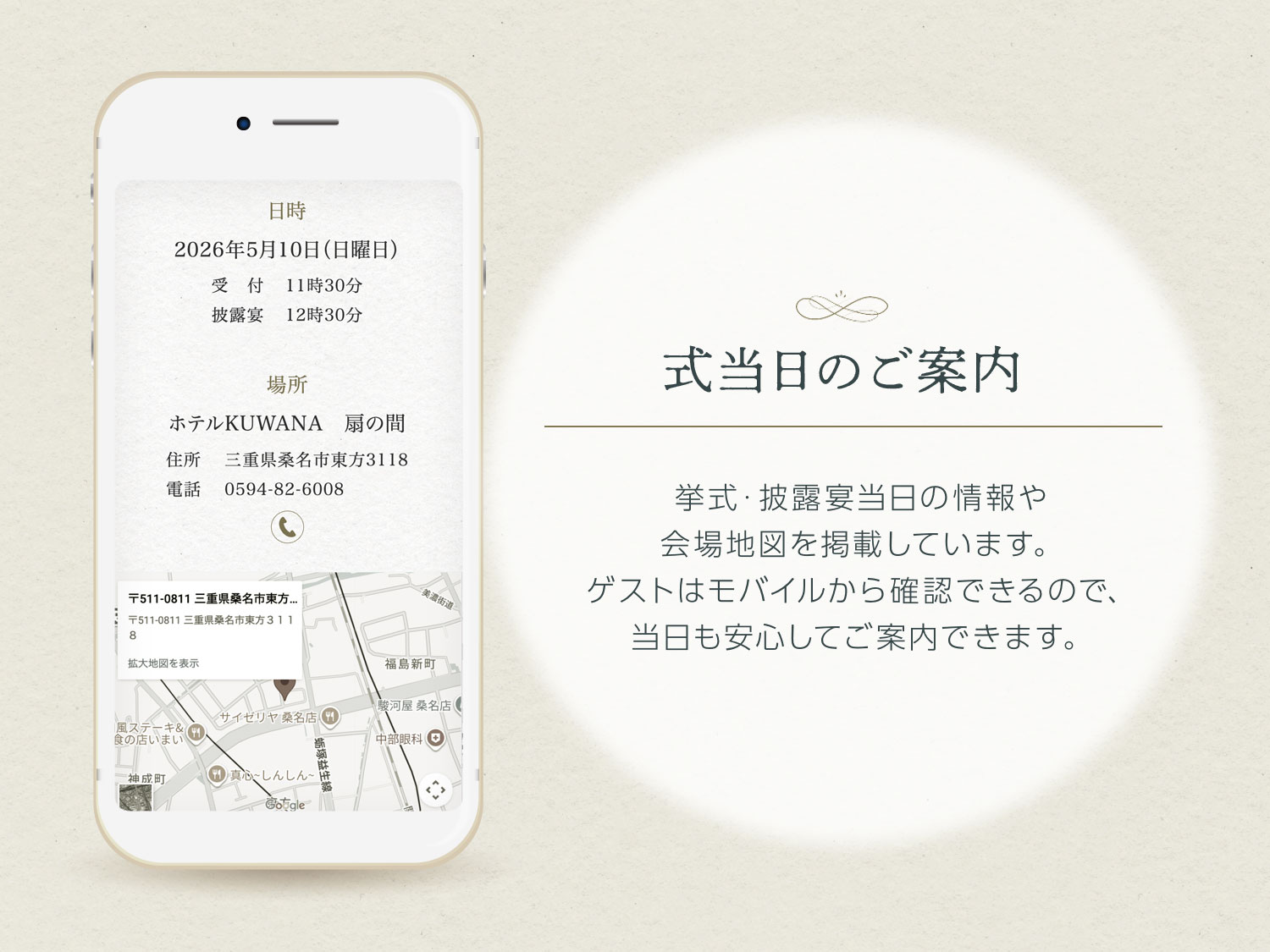 挙式・披露宴当日の情報や会場地図を掲載しています。 ゲストはいつでもモバイルから確認できるので、当日も安心してご案内できます。