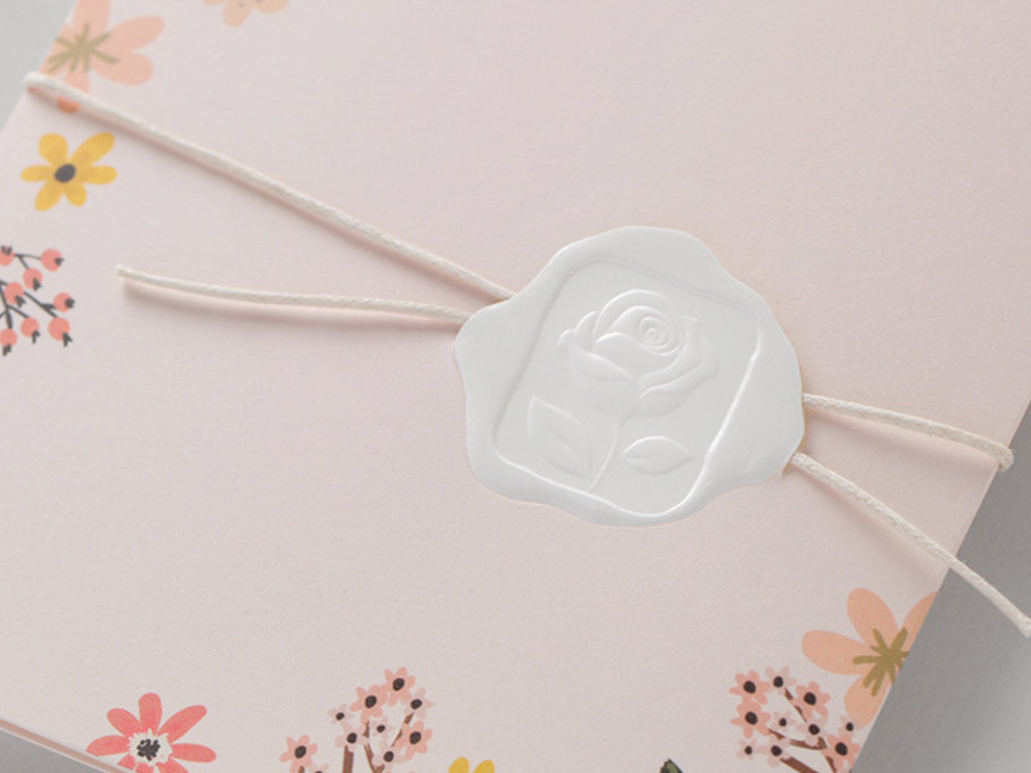 ピンクトーンの背景に爽やかなリーフをカラフルにデザイン。彫刻のようなバラの花のパターンは高級シーリング風、リボンで留めます。