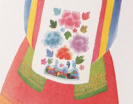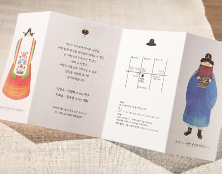 きれいな伝統婚礼服を着た新郎新婦が印刷されています。結婚への誓いを立てる二人をほわっと温かい雰囲気の色合いで演出しています。