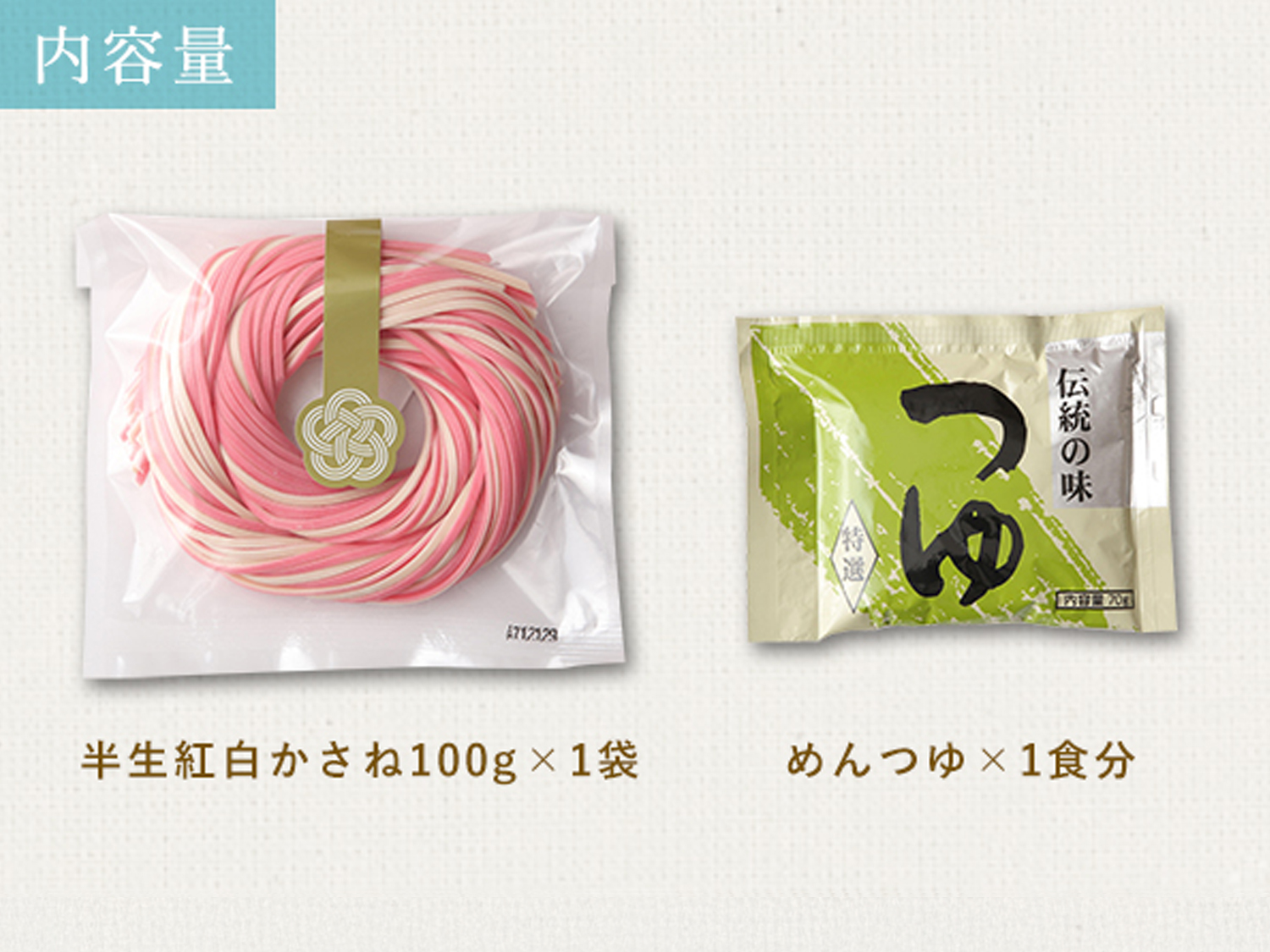 1食入り(半生紅白かさね(うどん)100g1袋、めんつゆ 1食分入り)