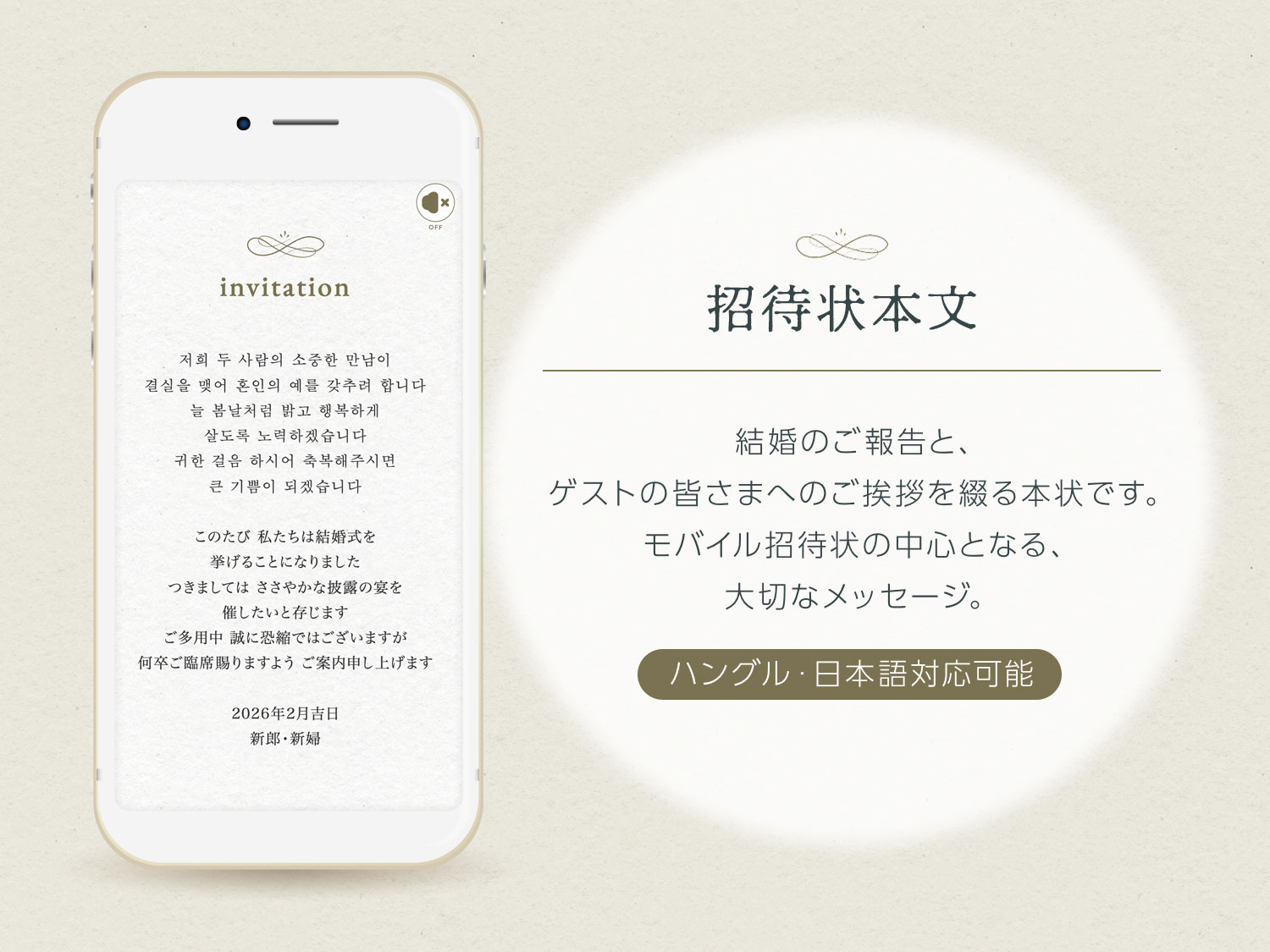 結婚のご報告と、ゲストの皆さまへのご挨拶を綴る本状です。 モバイル招待状の中心となる、大切なメッセージ部分です。 ハングル・日本語対応可能です。