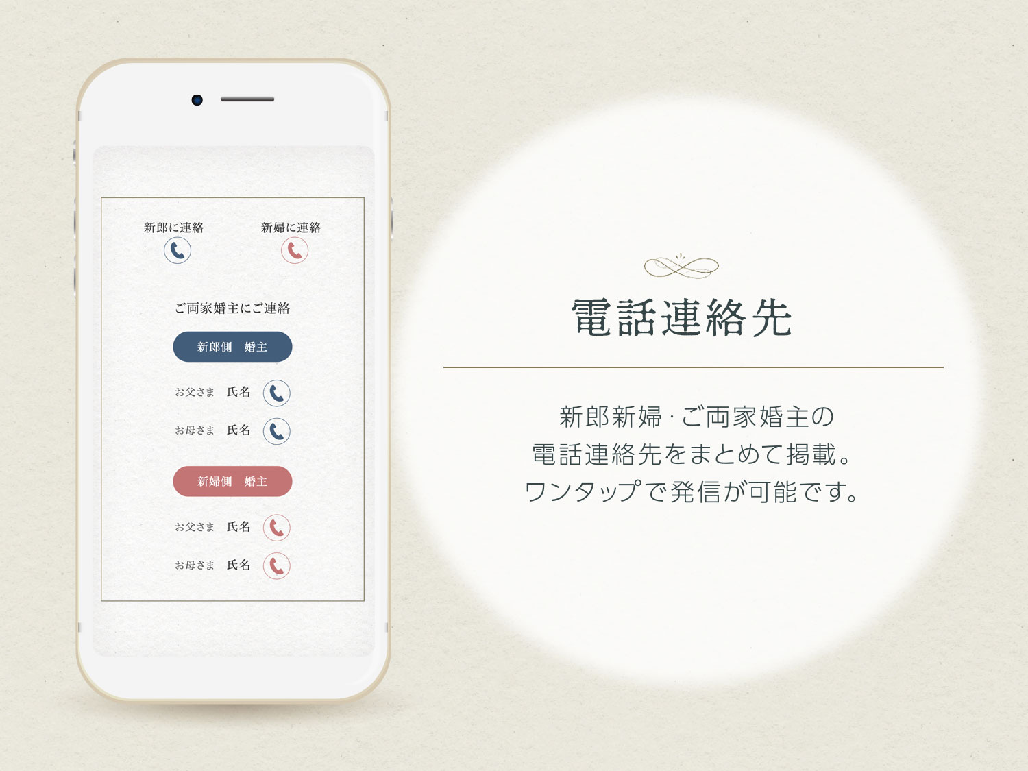 新郎新婦・ご両家婚主の電話連絡先をまとめて掲載。ワンタップで発信が可能です。