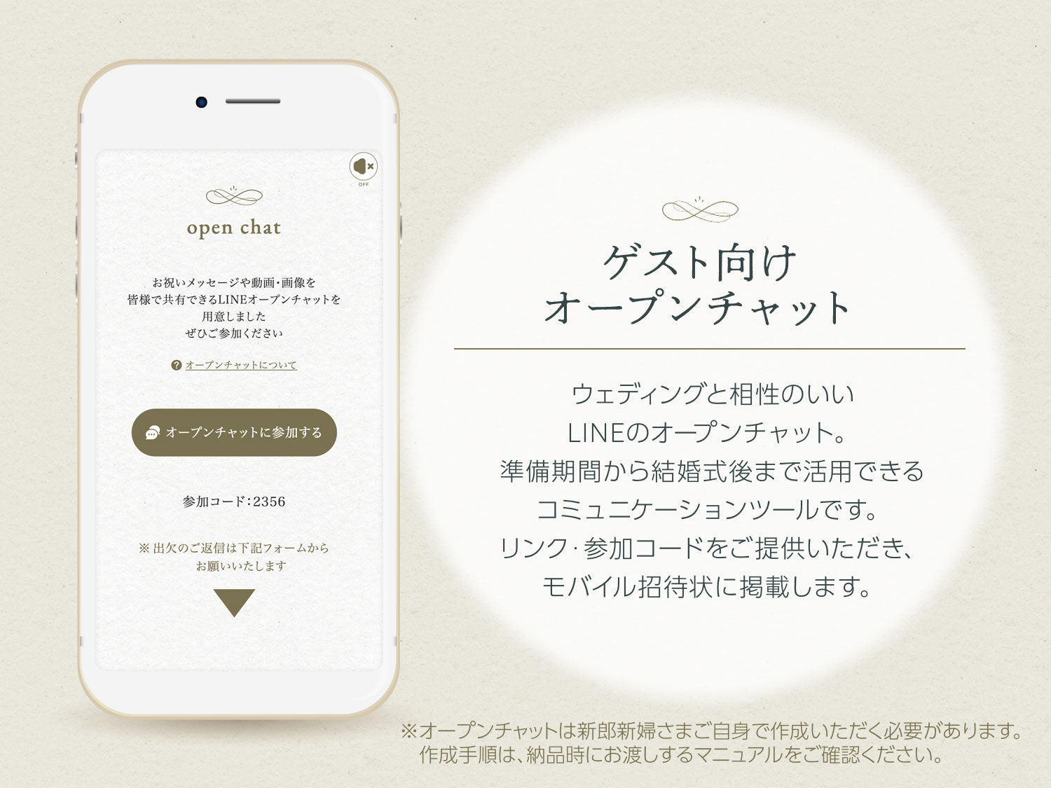 新郎新婦さまが作成したオープンチャットをご案内。 リンク・参加コードをご提供いただき、モバイル招待状に掲載します。