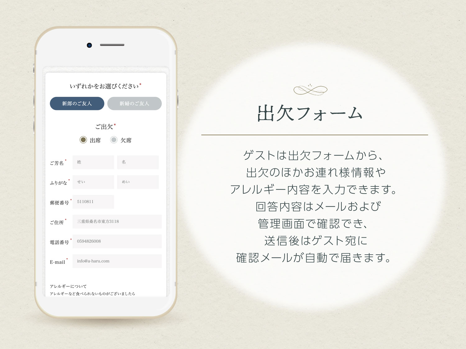 ゲストは出欠フォームから、出欠のほかお連れ様情報やアレルギー内容を入力できます。 回答内容はメールおよび管理画面で確認でき、送信後はゲスト宛に確認メールが自動で届きます。