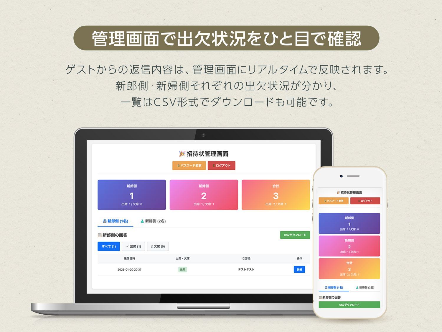 新郎側・新婦側それぞれの出欠状況が分かり、一覧はCSV形式でダウンロードも可能です。