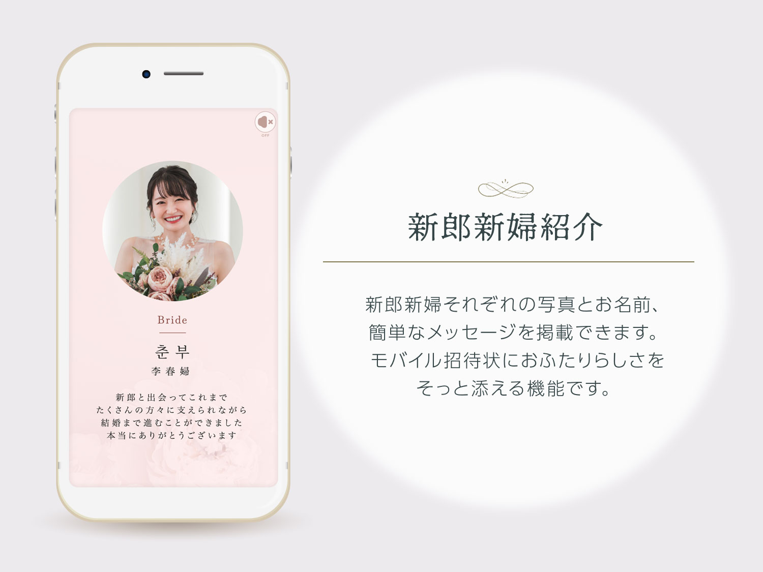 新郎新婦それぞれの写真とお名前、簡単なメッセージを掲載できます。 モバイル招待状におふたりらしさをそっと添える機能です。